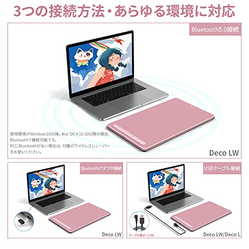 9つ目のおすすめペンタブレットは、XPPen ペンタブ Deco LW ワイヤレスです。このモデルは、Bluetooth接続によるワイヤレス機能を搭載しており、ケーブルの煩わしさから解放されます。また、8192レベルの筆圧感知能力と傾き検知機能を備えているため、細かいニュアンスの表現も可能になります。そのため、自由度の高い作業環境を求める初心者にも、高機能ながら手頃な価格でおすすめできます。